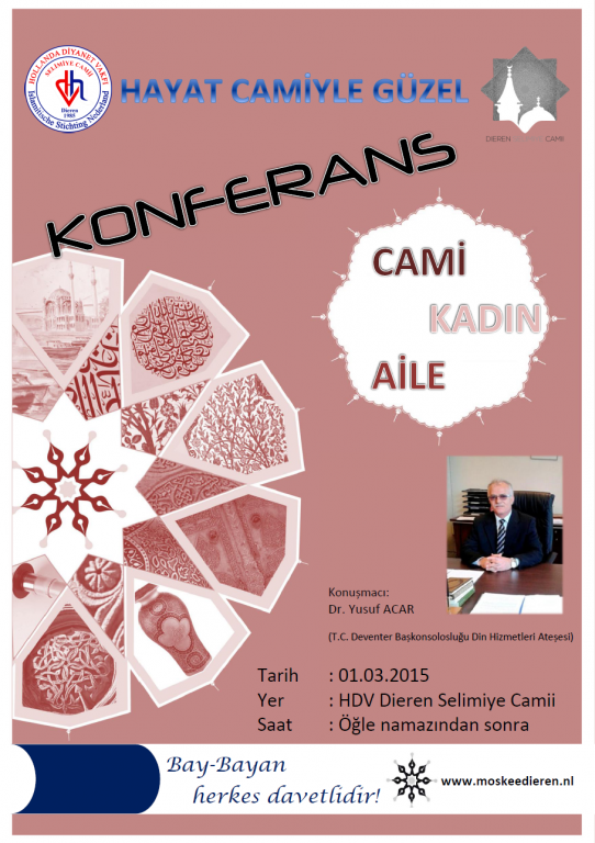 T.C. Deventer Baskonsoloslugu Din Hizmetleri Atesesi Dr. Yusuf ACAR'in da konusmalari olacagi Cami, Kadin ve Aile programi düzenlenecektir.